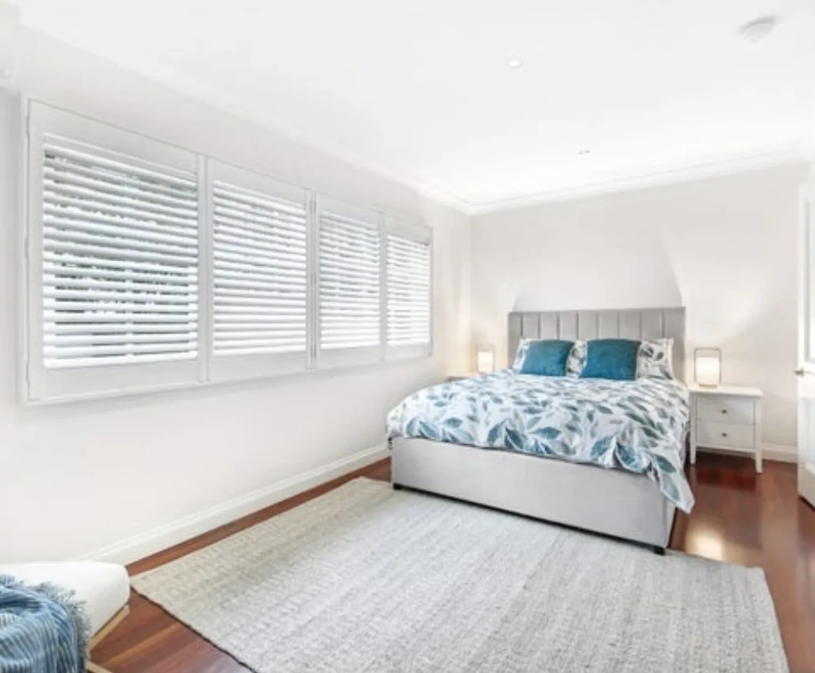 Spacious and well-lit with a queen-size bed, essential furniture, and shared bathroom access.