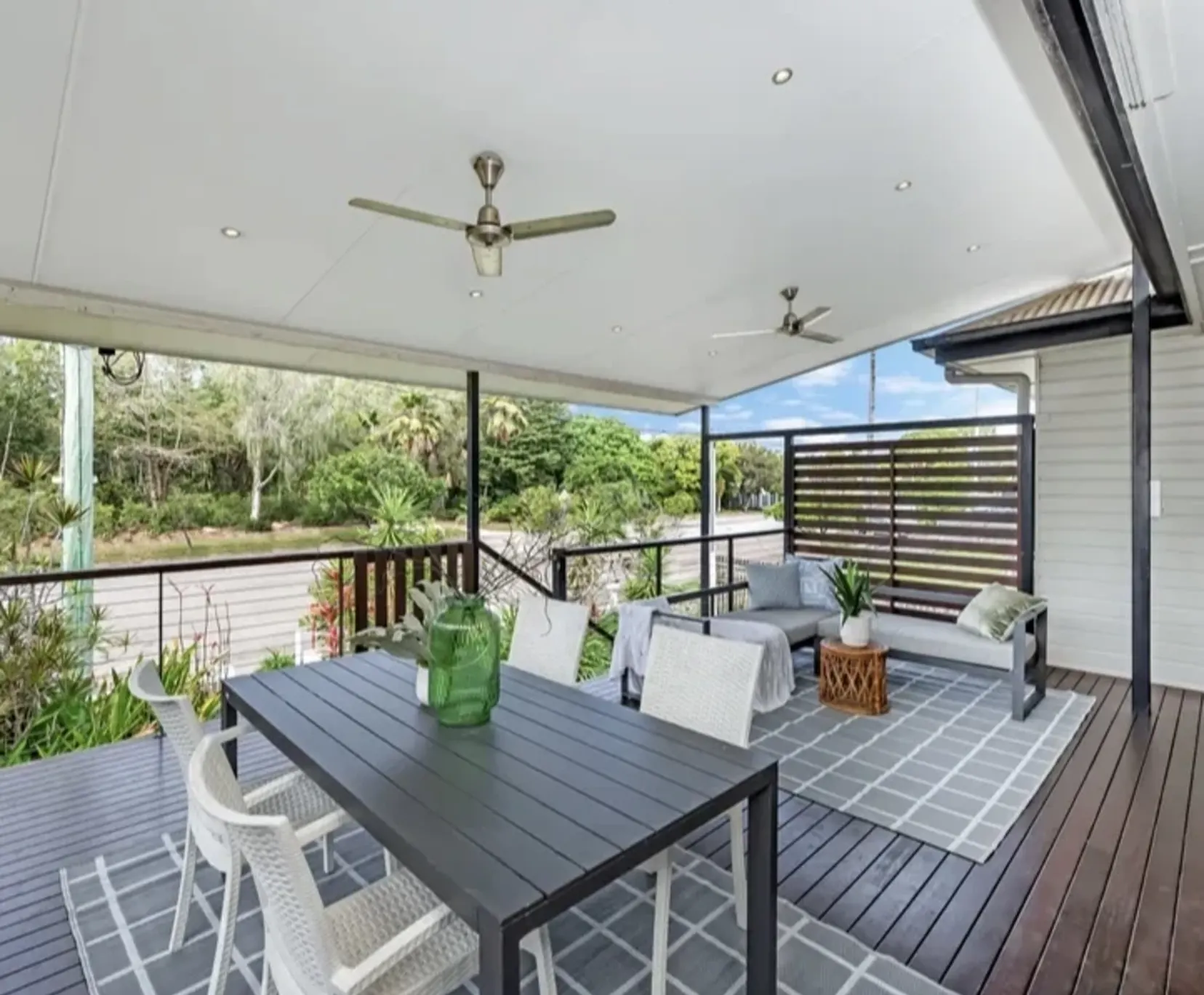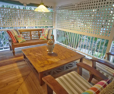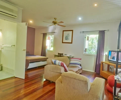 Enjoy a large, private granny flat with an en-suite, air-conditioning, high ceilings, and a verandah overlooking lush tropical gardens.
