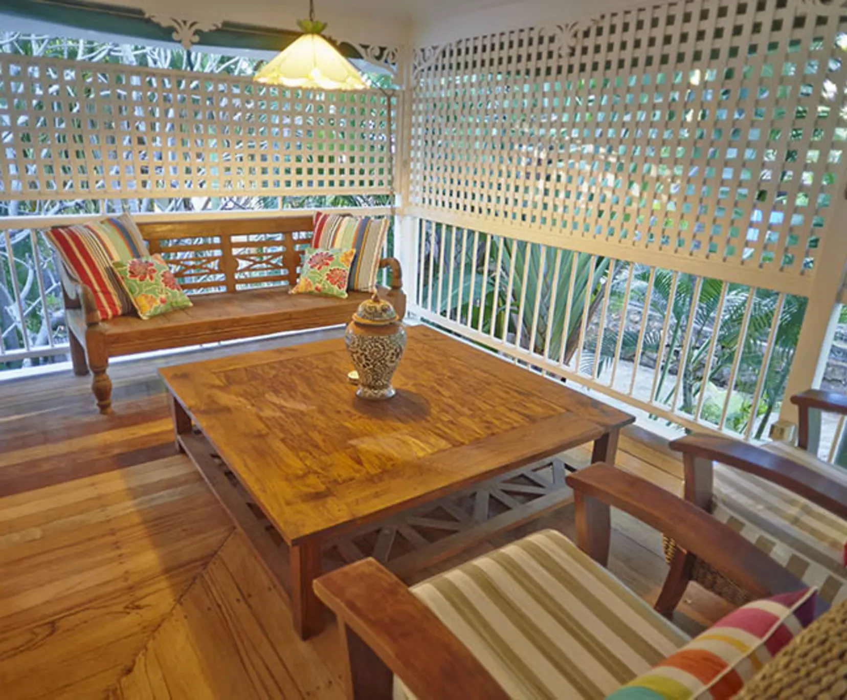 A spacious, stylish room with high ceilings, a queen-sized bed, and French doors opening to a tropical garden verandah.